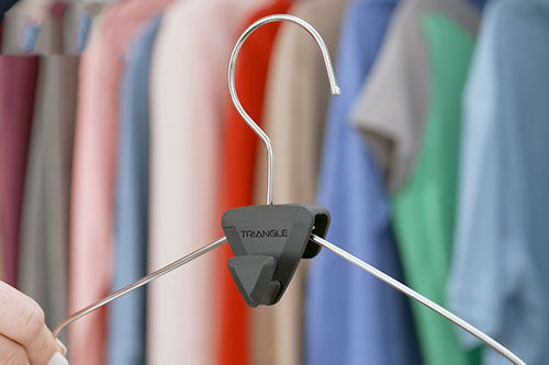 Transform your closet in minutes with Space Triangles – the ingenious slipover design that secures hangers in a perfectly vertical position and frees up to 70% more closet space! Snugly fitting all types of hangers from plastic to velvet, it works with any type of clothing from shirts and blouses to pants and jeans, even designer dresses. With Space Triangles, you can easily organize your closet and hang purses, belts, and more!